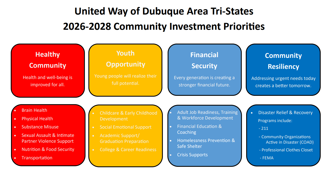 United Way brings people, organizations, and resources together to address the most pressing challenges in our community. Our work is foucused on advancing Healthy Communities, Youth Opportunities, and Financial Security.